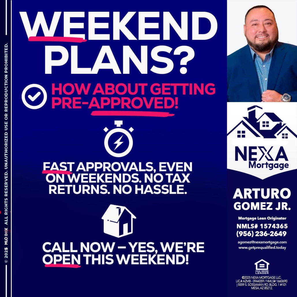 Hi, my name is Arturo Gomez Jr. I’m a Loan Officer with NEXA Mortgage LLC., offering personalized mortgage solutions, fast customized quotes, great rates and service with integrity.