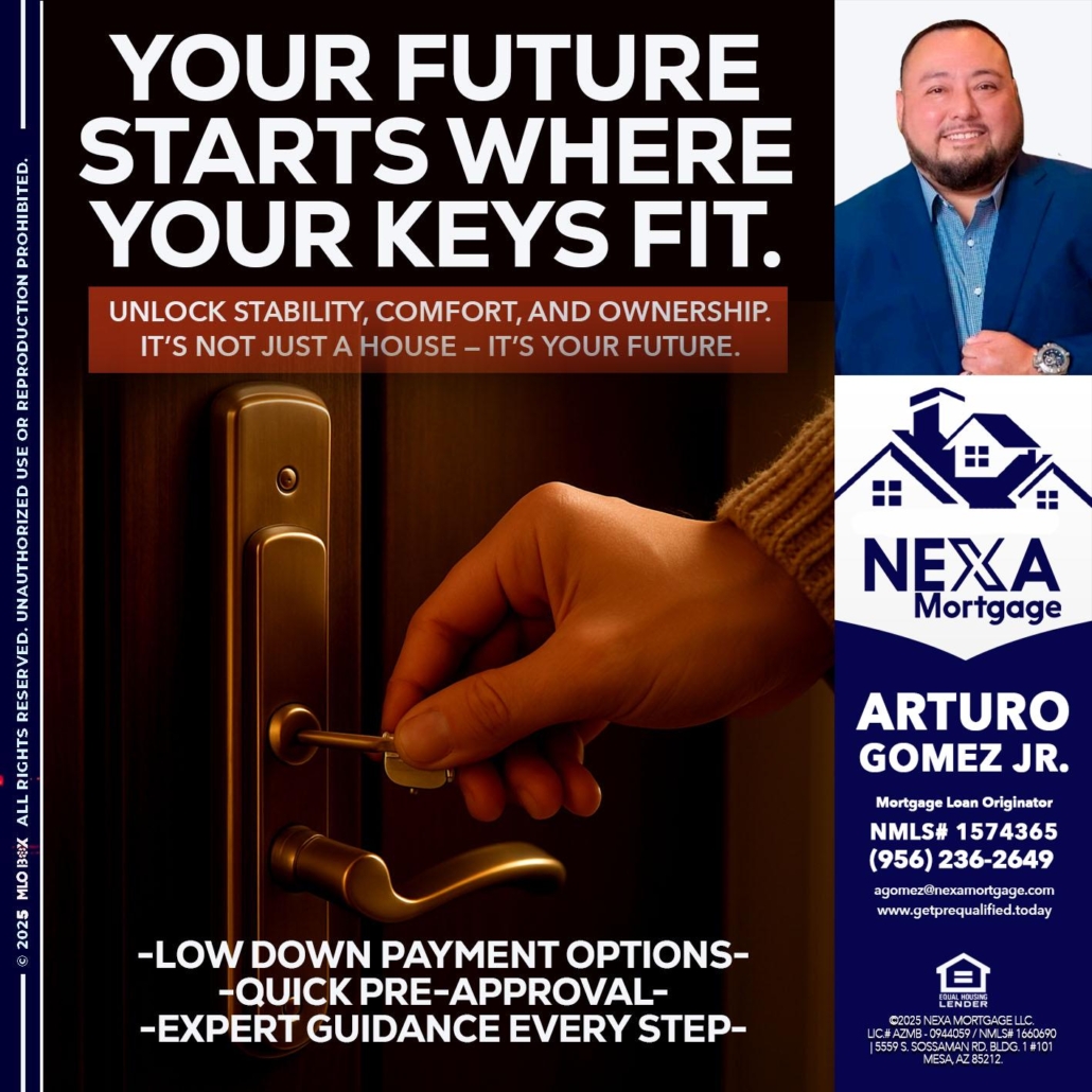Hi, my name is Arturo Gomez Jr. I’m a Loan Officer with NEXA Mortgage LLC., offering personalized mortgage solutions, fast customized quotes, great rates and service with integrity.